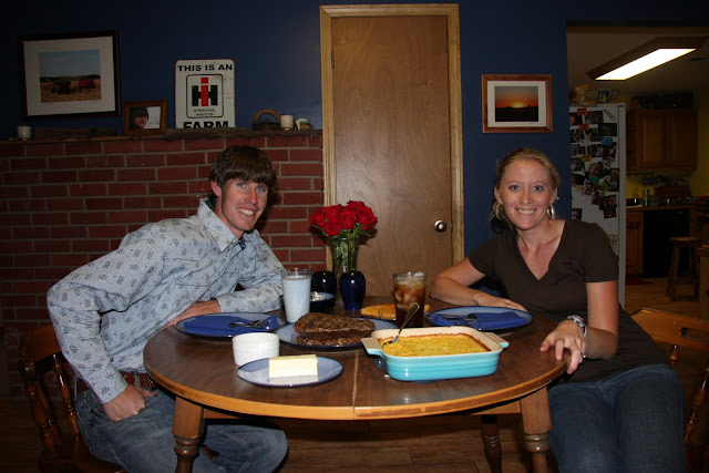 Well at least the rest of the day was uneventful. I clean some in the house and Caleb worked on puttin' the combine back together. Then he came home early and I fixed Steak, baked potatoes, creamed corn, and some cheesy garlic bread for supper and we had some homemade no-bake cheesecake (the next time I fix it I will share it with you cause it was delicious), and that was it. Nothin' special but it works for us....well it mighta been a little nicer if we hadn't had the morning rodeo, but that's one of those things that makes for some fun memories.
